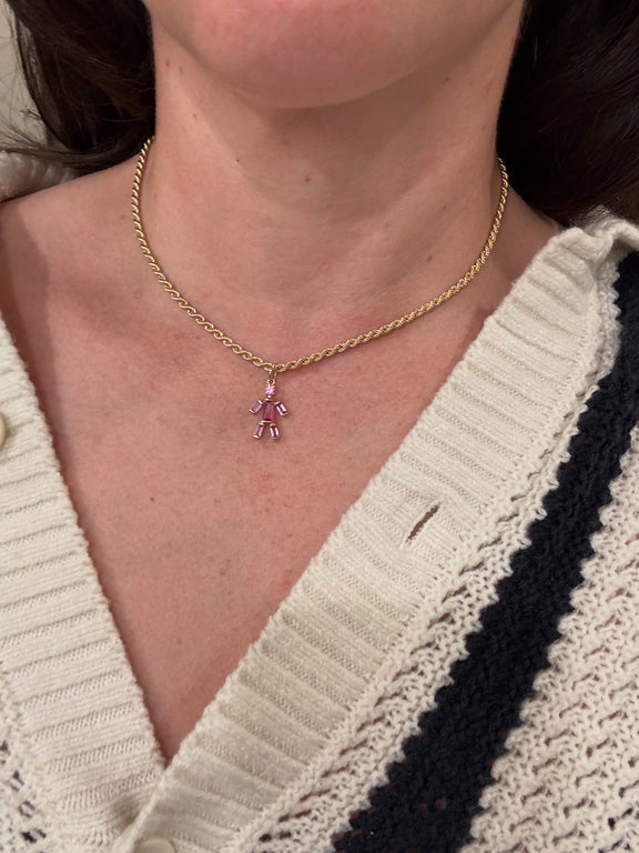 The charm that celebrates everything. A tiny figure crafted entirely from sapphires—round head, baguette-cut body—set in warm 14k yellow gold.