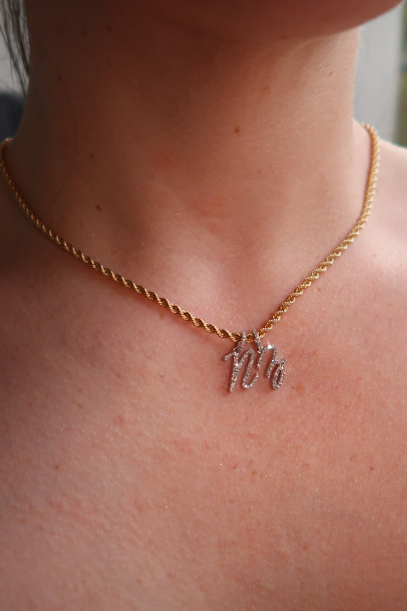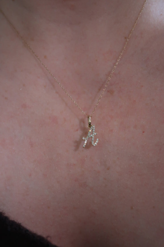 Your letter, your way. A flowing cursive initial in solid 10k gold, accented with diamonds—personal, elegant, unmistakably yours.