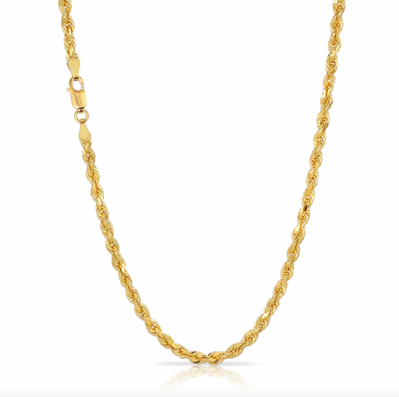 The chain that balances presence with wearability. Classic rope texture in 14k yellow gold—substantial look, lightweight feel.