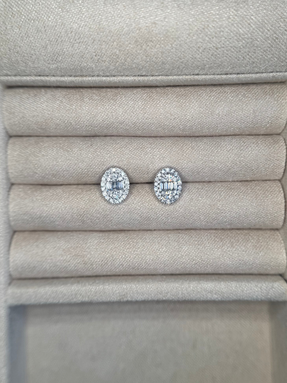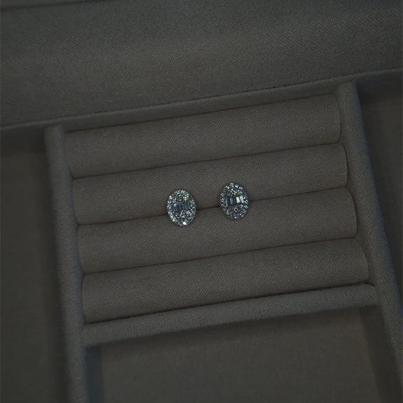 The earrings that play with perception. Oval-cut diamonds arranged in an illusion setting, surrounded by a brilliant halo—engineered for maximum size and fire.
