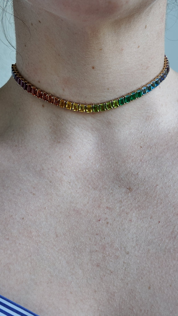 Why it's extraordinary: This isn't subtle, and it's not trying to be. A full spectrum of color wrapping around your neck in emerald-cut precision. Each stone catches light differently, creating a kaleidoscope effect that's impossible to look away from.