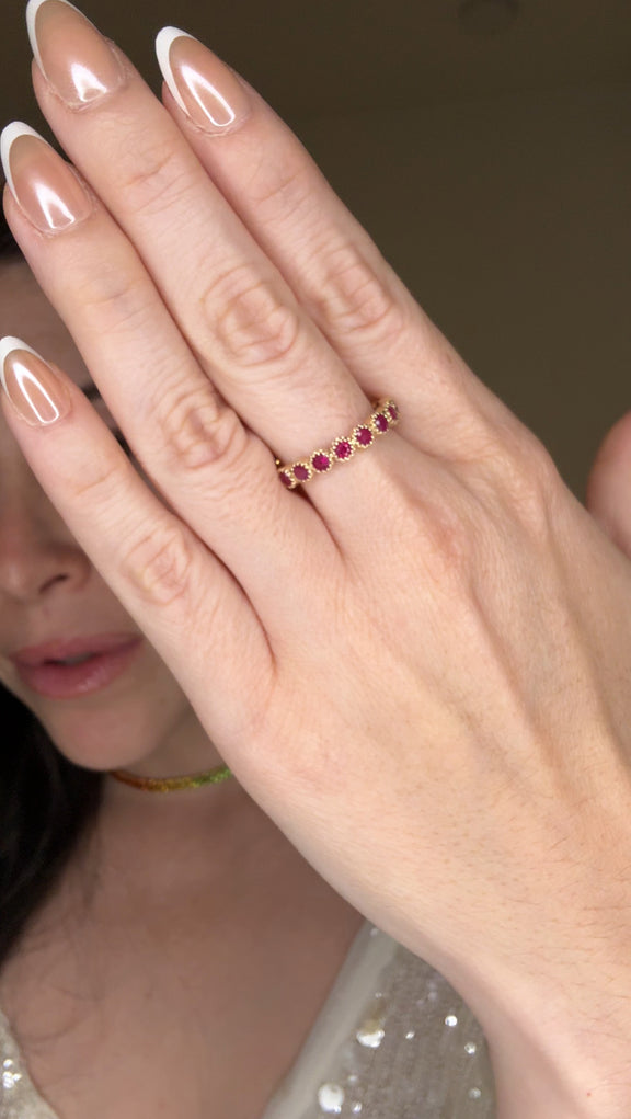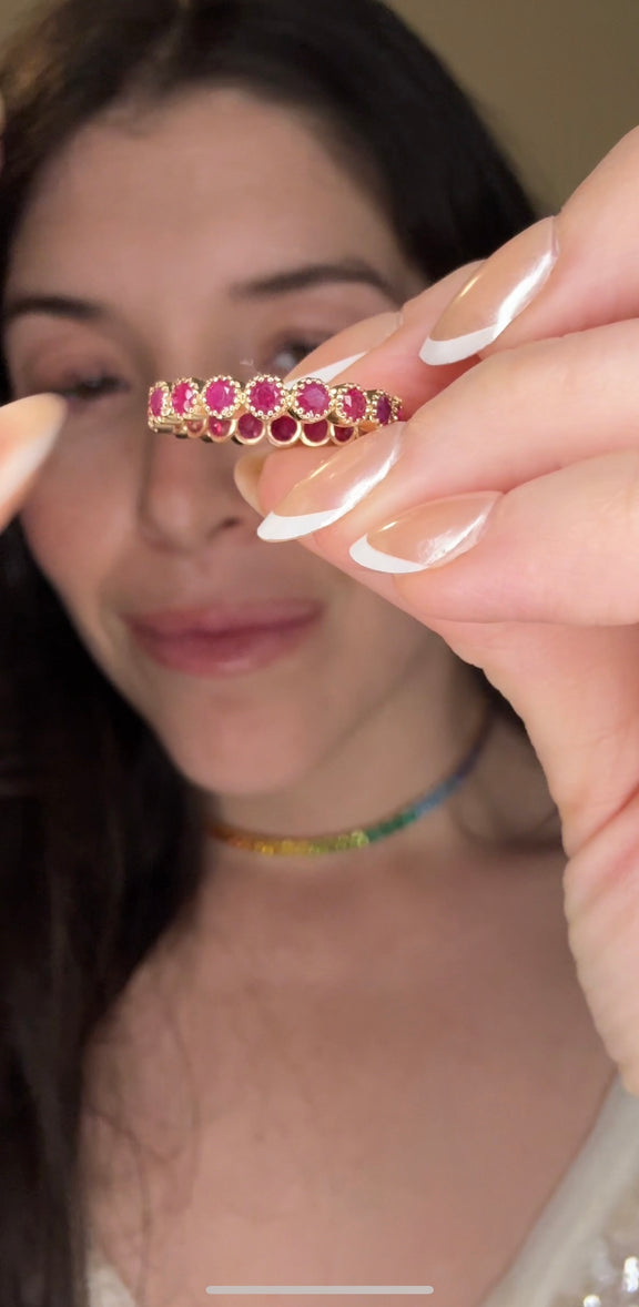 All the rubies wrapped around your finger. Round ruby red gemstones set in smooth bezels in 14k gold.